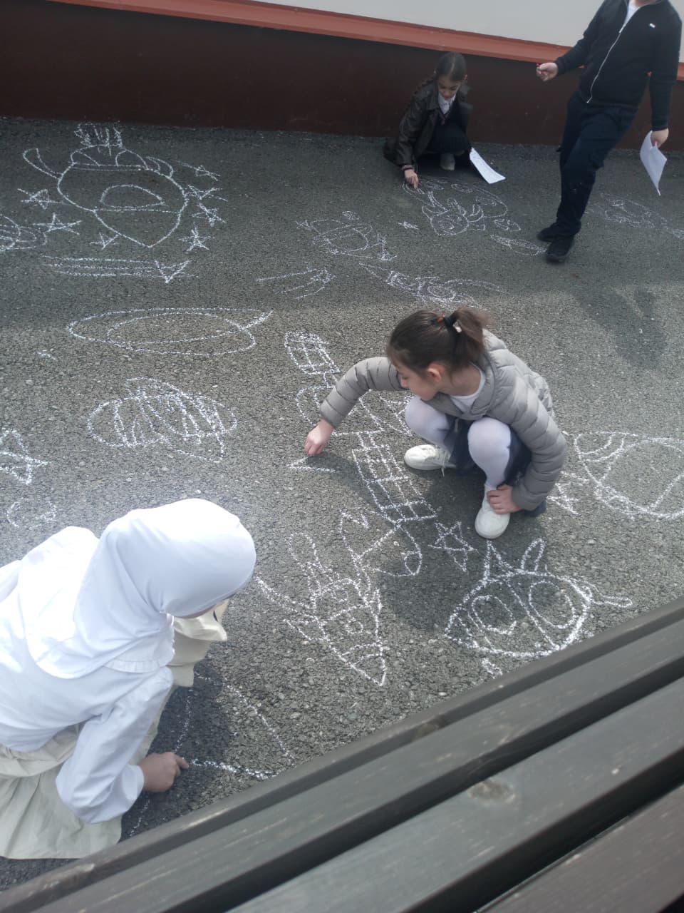 Ребята с большим увлечением играли цветными мелками, и вскоре асфальт на территории гимназии покрылся яркими рисунками. В них дети изображали ракету, небо со звездами, нарисовали космонавта. Детское творчество в технике коллективного рисунка мелом на асфальте позволяет не только проявить творческие способности, но зарядиться хорошим настроением и радостью от собственных «шедевров». С днем космонавтики!